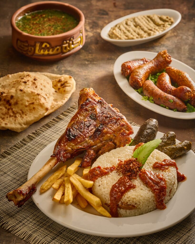 ثمن شيش + ثمن سجق + كفتة + كباب + أرز بسمتي + سلطة + طحينه + عيش